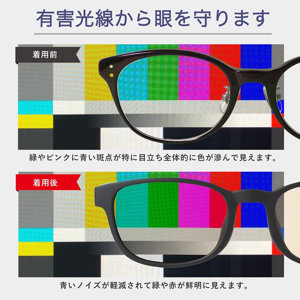 【有害光線カット性能】紫外線カット率99.9%、青色光線カット率42.1%、可視光線透過率82.4%(一般財団法人 日本眼鏡普及光学器検査協会調べ)